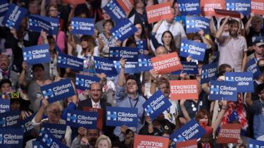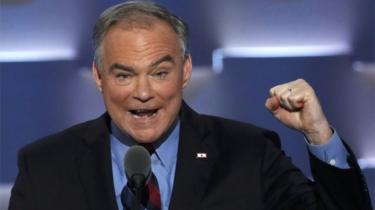Image copyrightGETTY IMAGESImage captionDelegates hold up campaign signs as Senator Tim Kaine speaks