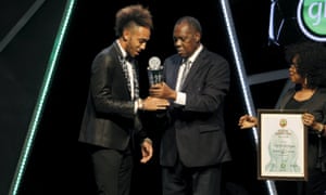 Aubameyang accepts the award from the Fifa acting president Issa Hayatou in Nigeria. Photograph: Afolabi Sotunde/Reuters